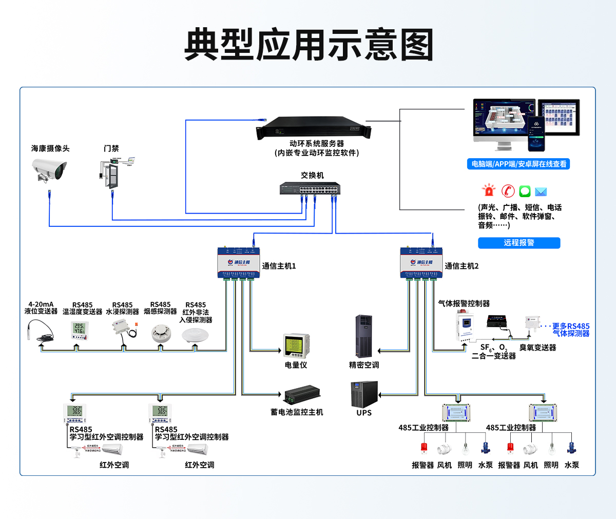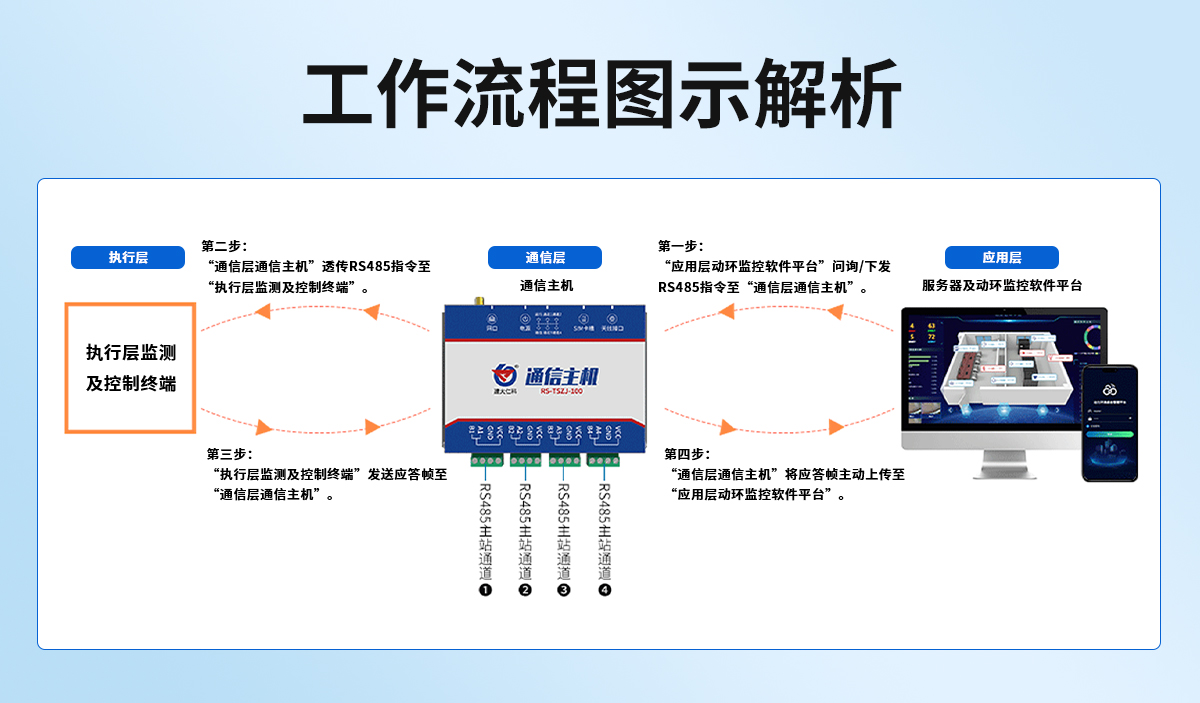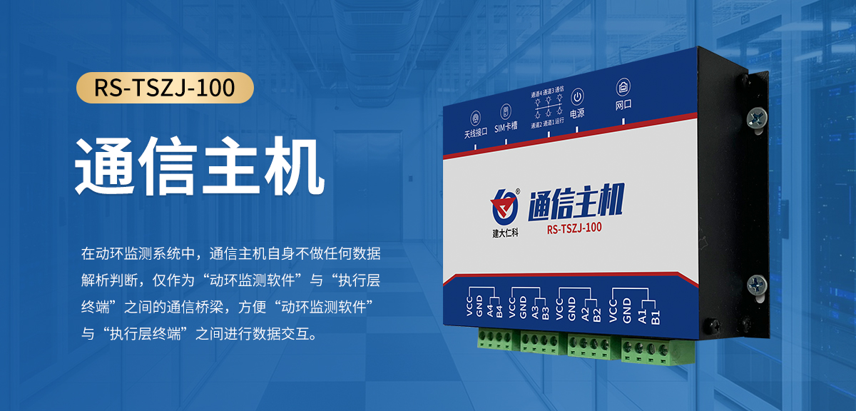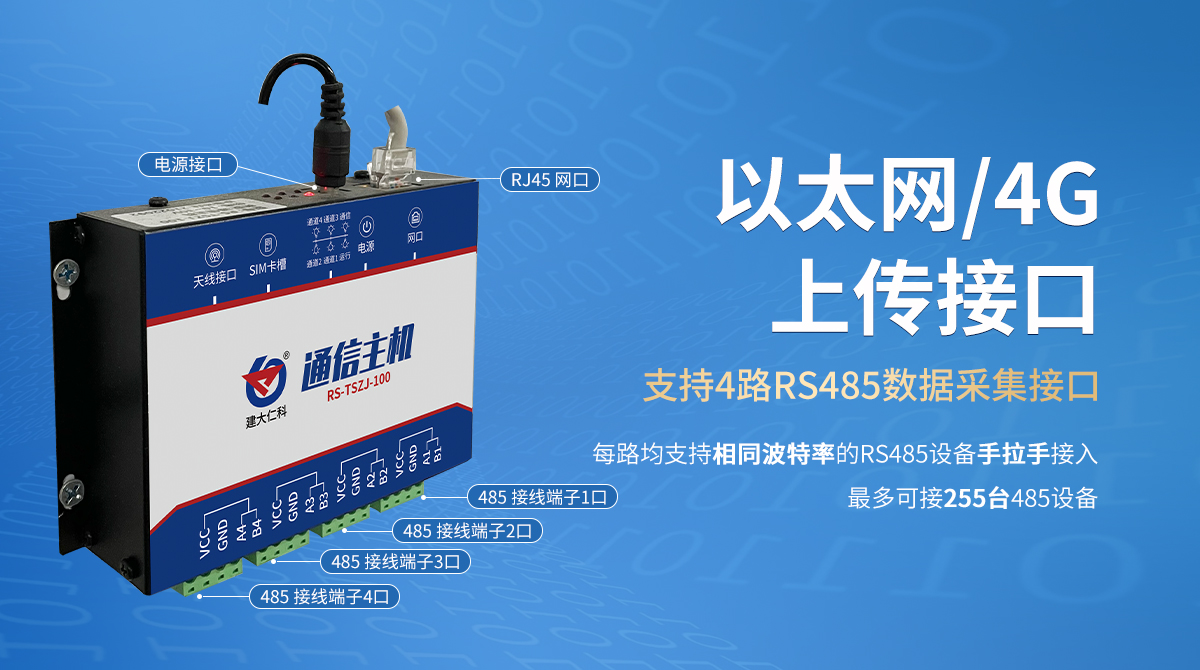 通信主机主要用于平台与传感器设 备之间的通信连接,可网口或4G上 传数据,供电10~30V, 4路下行485接 口,每路接口可单独设置不同的波特 率,最多可接255台485设备。