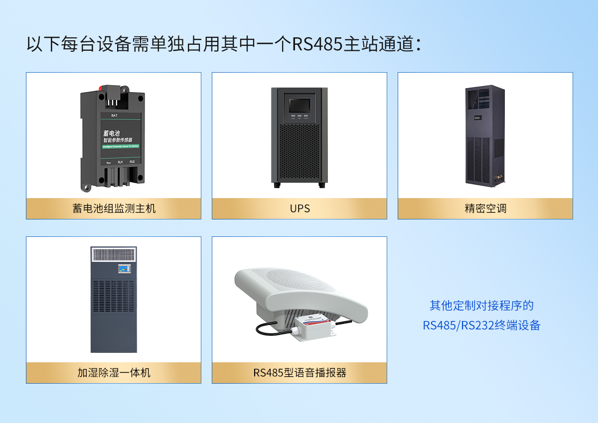 RS485 接口×4,每路能采集相同波特率的 1~254 台 485 接口 的设备数据,长通信距离≤1500 m