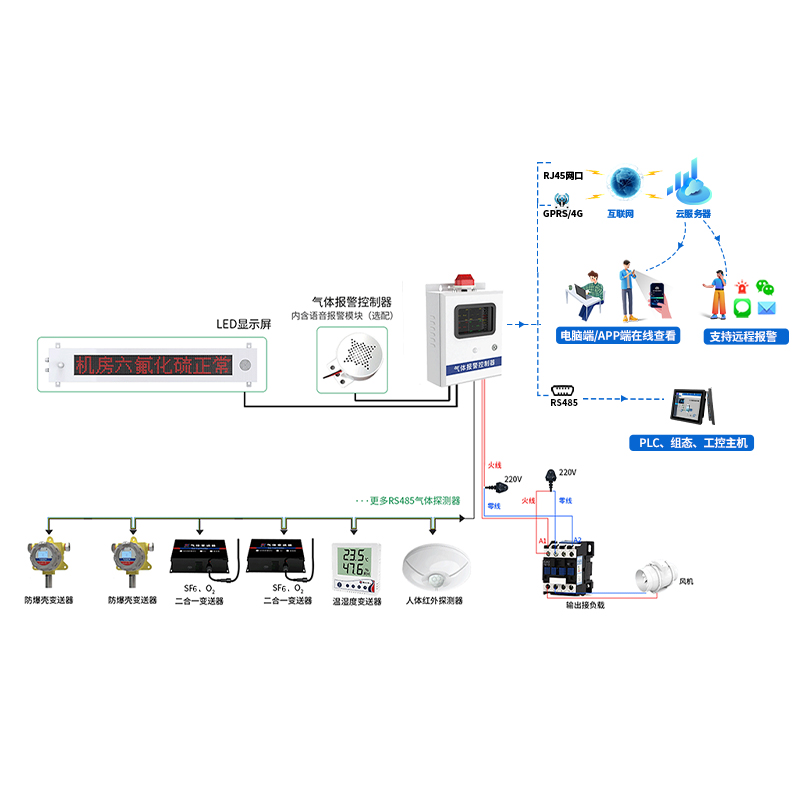 高压组合电器配电室六氟化硫监测系统是集配电室内环境监测(六氟化硫、氧气、温湿度、红外人体探测等),风机联动控制,智能语音声光报警以及智能环境监控云平台于一体的智能配电室环境监测管理体系,其总体建设目标是保障配电室的电力设备安全运行,防止因环境改变、设备状态变化而引起的事故,满足配电室远程运维的可靠管控要求。