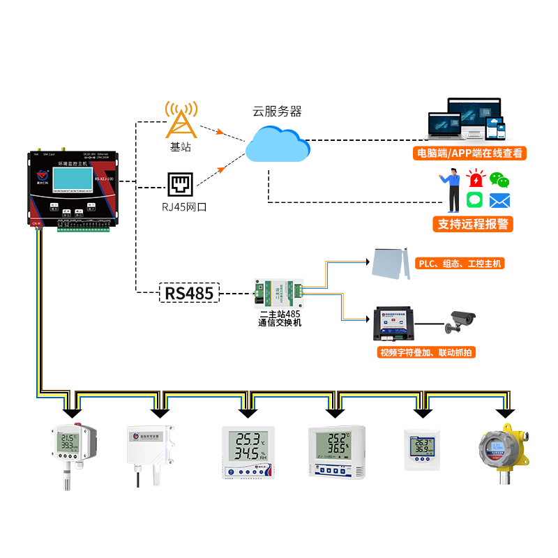 RS485温湿度监测系统由485型温湿度变送器、环境监控主机和环境监控云平台组成。充分利用RS485总线布线的方式,实现一个小空间区域范围内多点位、远距离的数据采集和传输,适用于监测点位分区域相对集中,且项目预算较低的场合。