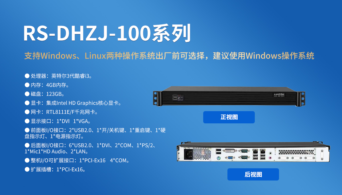 | 前面板I/O接口 | 2*USB2.0、1*开/关机键、1*重启键 1*硬盘指示灯、1*电源指示灯 |